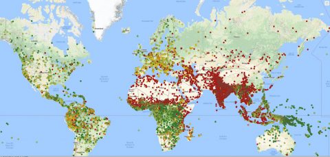 En oversikt over verdens folkegrupper. Rødt er de som fremdeles regnes som unådde, med en gradering til mørk grønn for dem som er betydelig nådd med evangeliet. (joshuaproject.org)