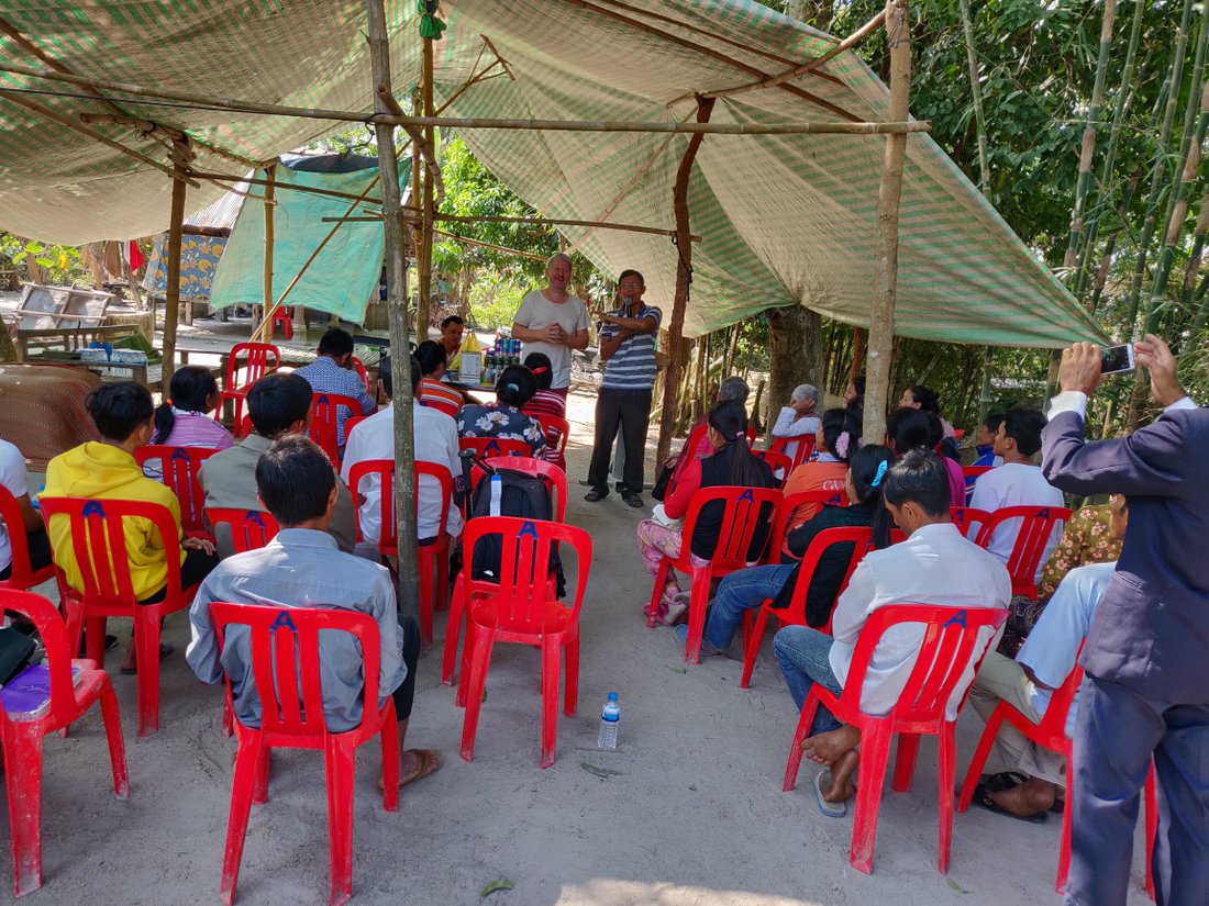 Etter noen timer bakpå mopeden når jeg et nytt mål for dagen, langt utpå den tørre landsbygda i Takeo provins sør-øst i det tidligere krigsherjede Kambodsja. Vi er ikke langt unna den vietnamesiske grense. Sola varmer og feltleder Tim Poleak er en stødig mopedfører. Her på en avsidesliggende gård holder evangelistekteparet Yorm og Savorn til. Her har Yorm vokst opp og her har ekteparet sammen oppdratt sine tre barn som alle er troende kristne. Gården består av flere bygninger og skur. Det viser seg snart at tre av bygningene er, har vært eller skal bli kirke for en av ekteparets fire menigheter og huskirker.