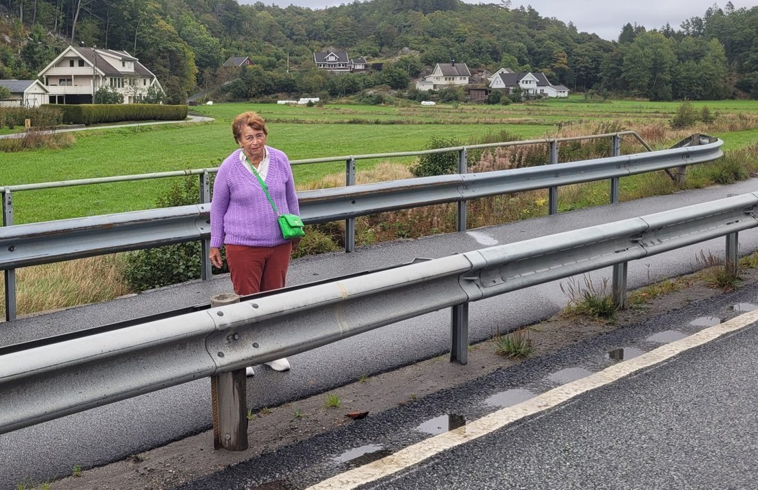 Olaug Gundersen på ulykkesstedet ved Imesletta sør for Mandal. Huset hun bodde i ses i bakgrunnen til venstre.