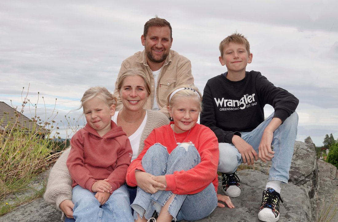 Hans Martin Skagestad sammen med familien sin utenfor huset deres i Kristiansand. F.v: Hans Martin Skagestad (36), Theodor (13), Alma(4), Camilla (35) og Celina (9).