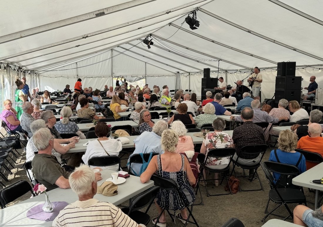 Kaffelukta kjennes når man nærmer seg teltet som er slått opp rett utenfor hallen. Klokka har bikket fem på ettermiddagen og det er tid for ettermiddagskaffe. Den ene etter den andre kommer inn i teltet og forsyner seg med kake og kaffe. Folk benker seg rundt bordene og småsnakker litt. Det er tid for «senior-planeten». Sten Sørensen griper mikrofonen og hilser de frammøtte velkommen og dermed er «festen» i gang.