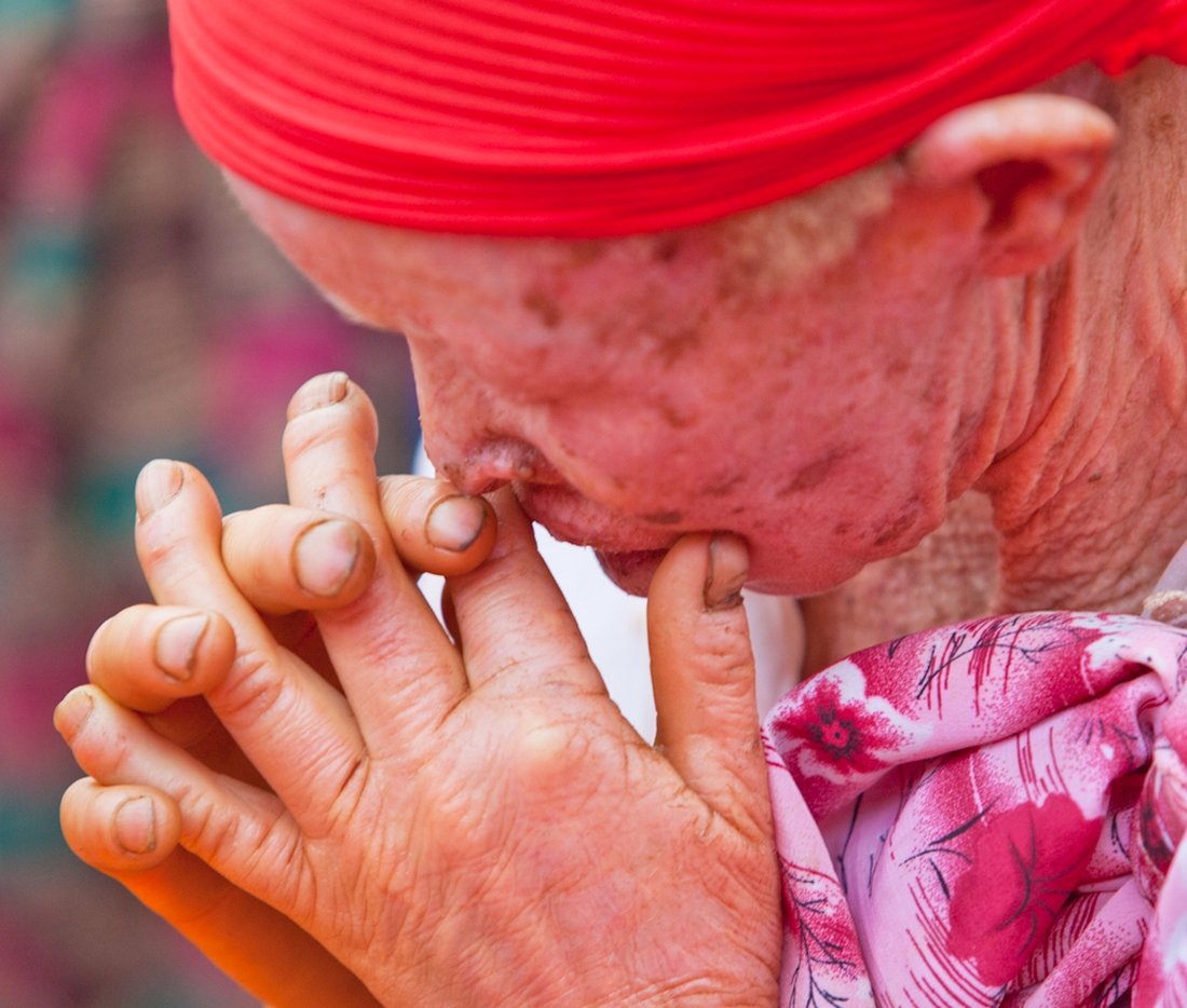 Albinokvinne ber frelsesbønnen under Kampanjen i Muhanga.