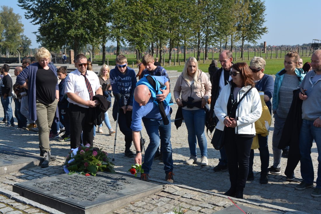 Sola varmer i ryggen en høstdag i oktober mens 46 ungdommer, 20 foresatte og en lærer fra Kvinesdal ungdomsskole står ved minnesmerket over drepte nordmenn i Auschwitz-Birkenau konsentrasjonsleir. En bukett blir nedlagt og så rettes oppmerksomheten mot minnesteinen ved siden av.